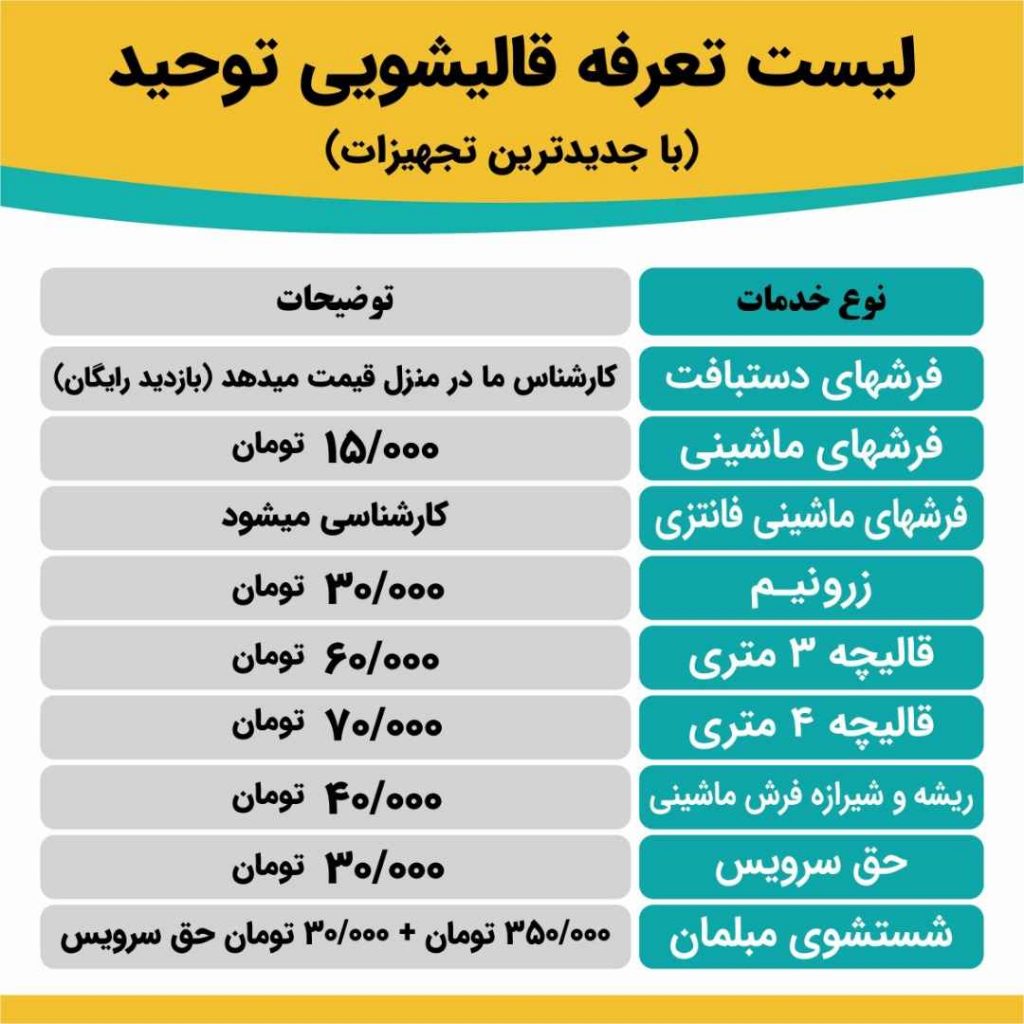در بخش انتهایی به مسئله مهم قیمت میرسیم. با وجود آنکه در مجموعه ما تخصصیترین و بهترین خدمات قالیشویی، فرش شویی و مبل شویی انجام میگردد سعی بر رعایت نکات دیگری نیز داریم. نرخ خدماتی که ما ارائه میدهیم منصفانه و با توجه به تعرفه مصوب طبق جدول زیر ارائه میگردد. مشتریان عزیزی که سابقه همکاری با ما را دارند، خاطرنشان میکنند که در قبال خدماتی که دریافت میکنند، هزینه معقولی پرداخت میکند.